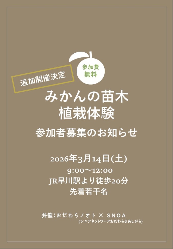 2/21(土)に開催予定のみかん農園プロジェクト『みかんの苗木植栽体験イベント』にたくさんのご応募をいただき、